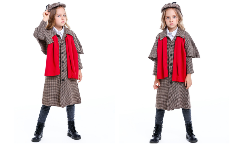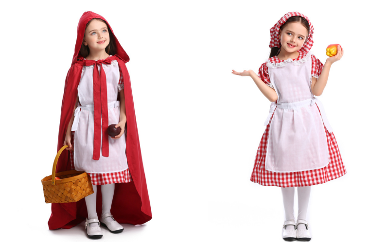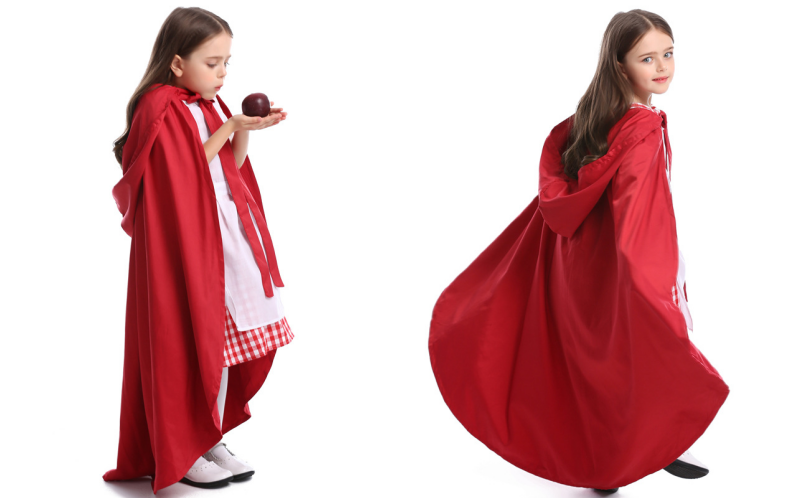 小紅帽的套裝是一件紅色格子蕾絲洋裝,搭配白色圍裙,以扮裝的服裝來說算是不會太浮誇的,平時也可穿!另外整套還搭配一件很厚實的紅色斗篷,穿到秋天都沒有問題!
