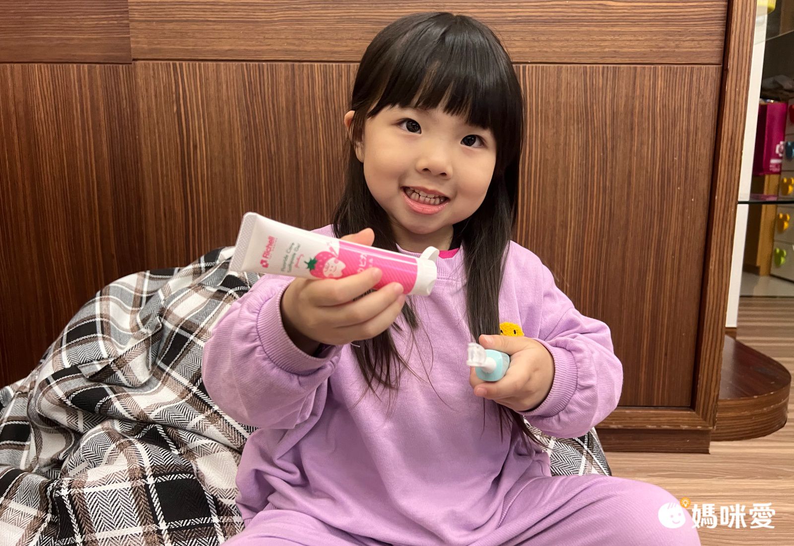 牙膏是透明凝膠狀,讓她放下了戒心,開心刷牙,使用後還一直跟我分享,那個草莓味香香的,隔天還點名使用它呢~