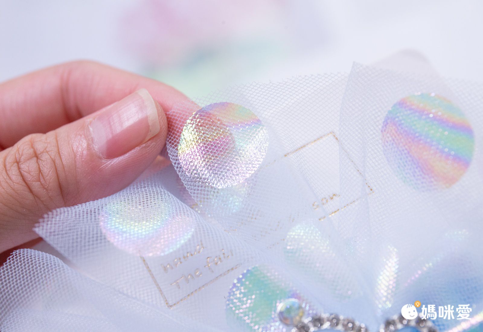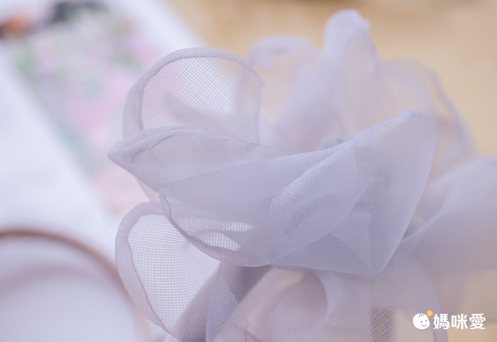 喜歡簡單一點,元素不要那麼多,很推薦媽咪帶這款喔!相較於前一款,這款有點偏透明,且不那麼多層次的網紗,較為低調又不失夢幻