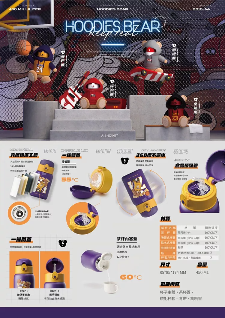 材質:茶杯蓋 塑膠(PP)/吸管式杯蓋 塑膠(PP)、矽膠/飲水式杯蓋 塑膠(PP)/矽膠密封圈、吸管 矽膠/瓶身 塑膠(PP)、316不鏽鋼、304不鏽鋼/杯套、杯帶 潛水料(SBR)、棉、纖維、塑膠(PP)