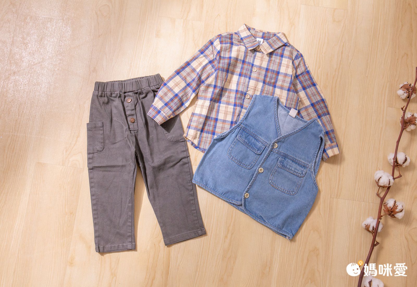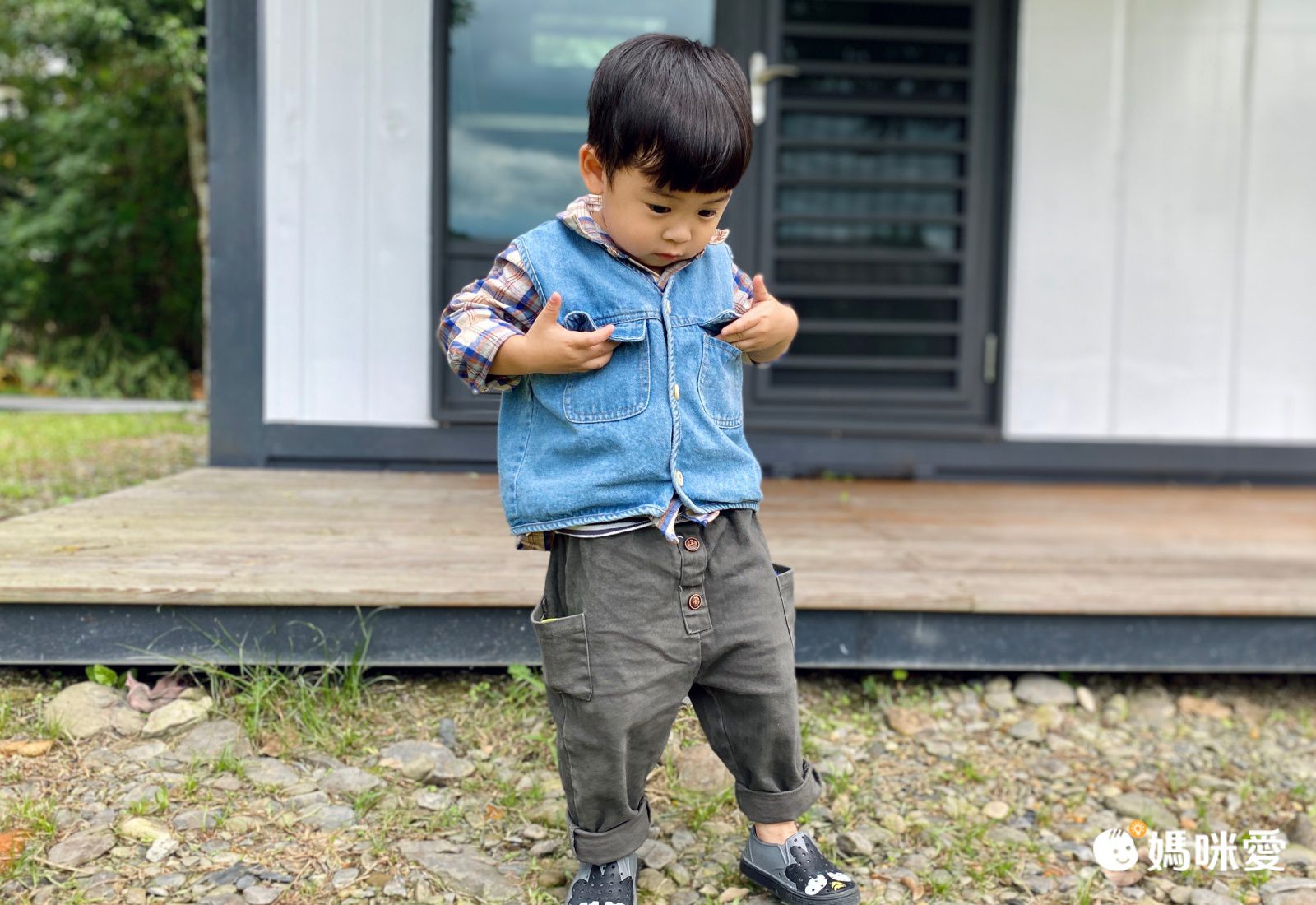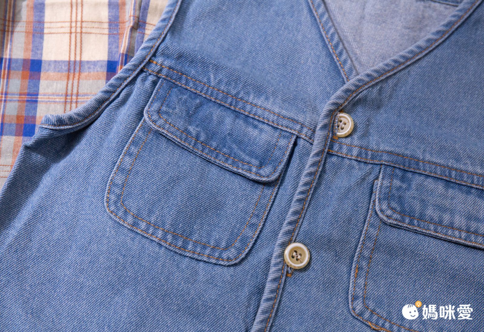 寬鬆的牛仔背心,簡單的三顆扣子+V領設計,休閒感十足。前面2個口袋可以放些男寶的小寶物跟玩具