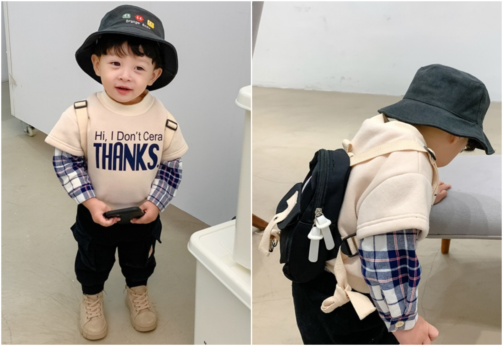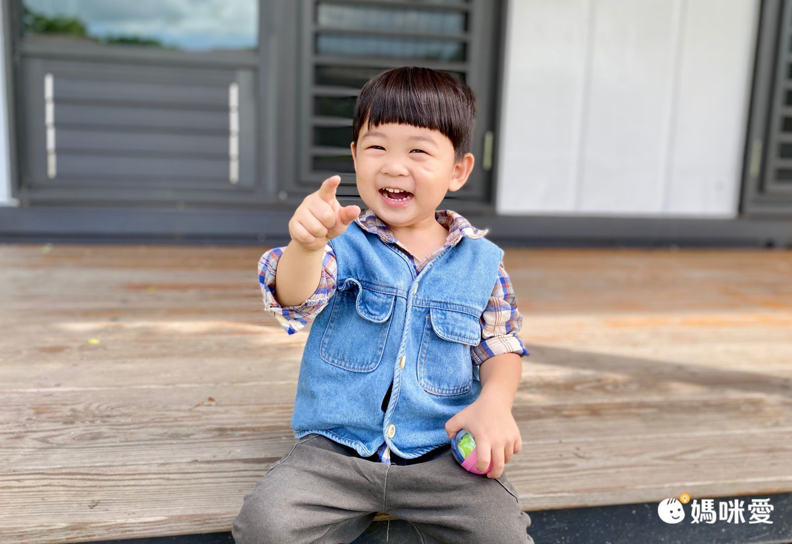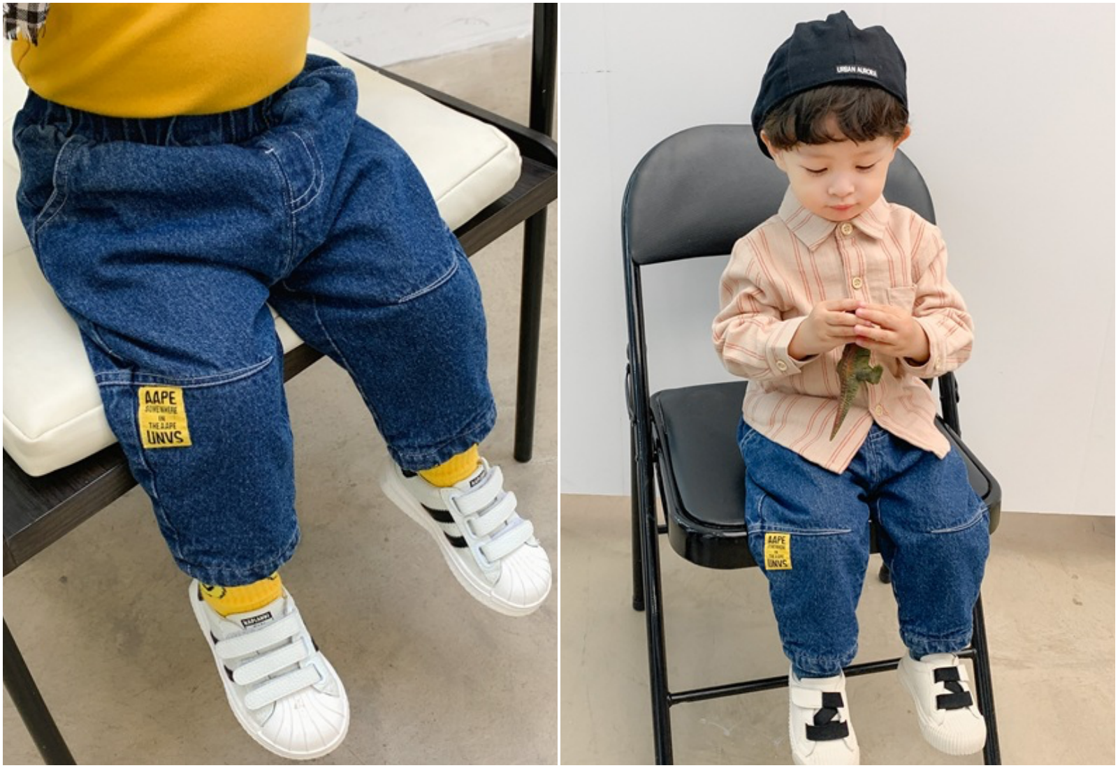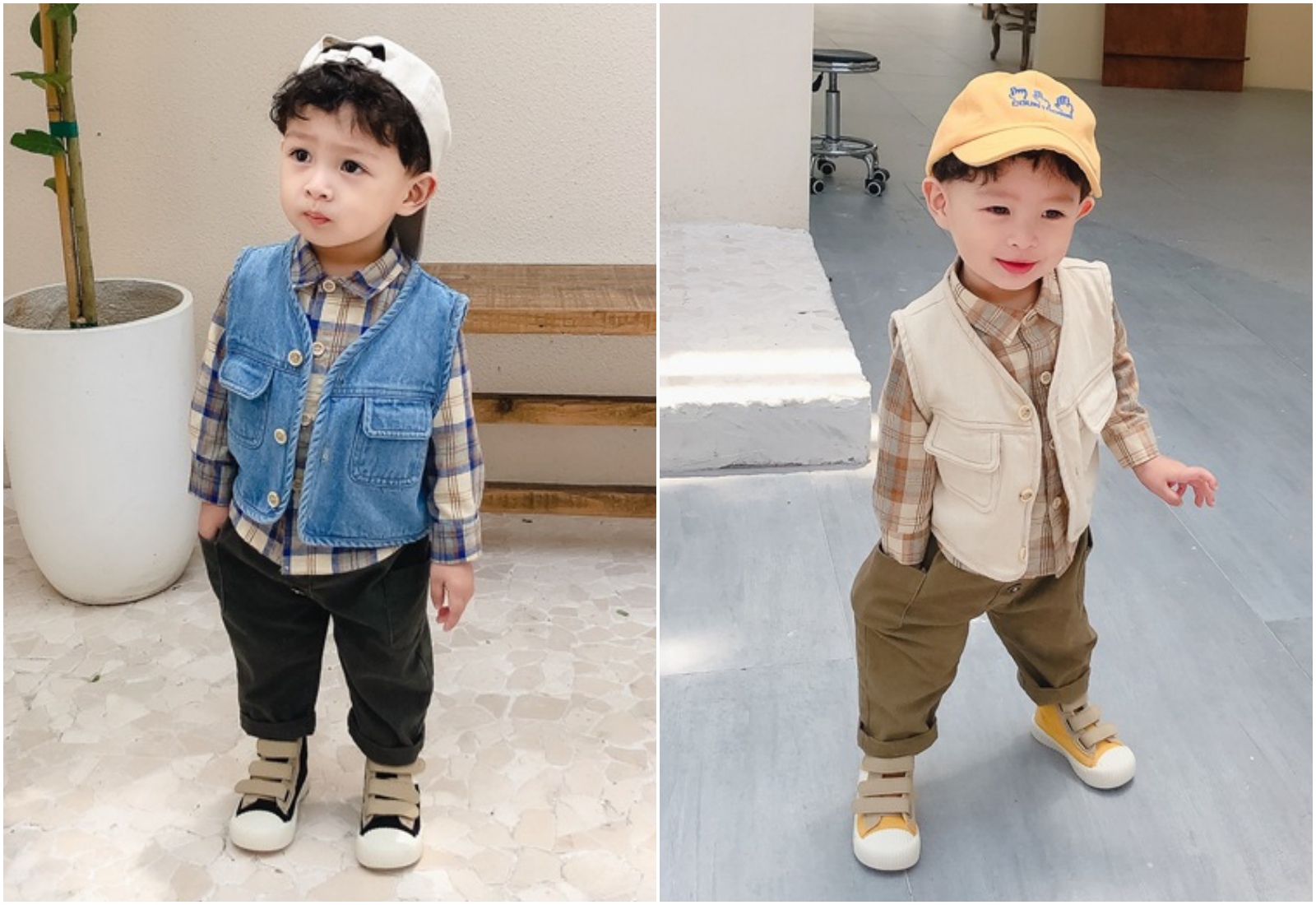 寬鬆的牛仔背心,簡單的三顆扣子+V領設計,休閒感十足。前面2個口袋可以放些男寶的小寶物跟玩具
