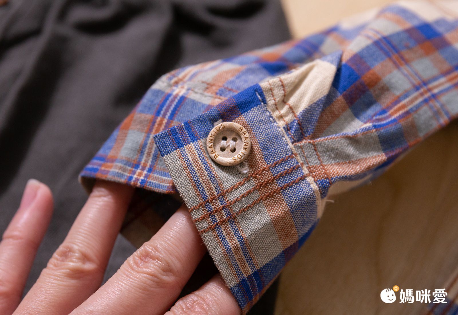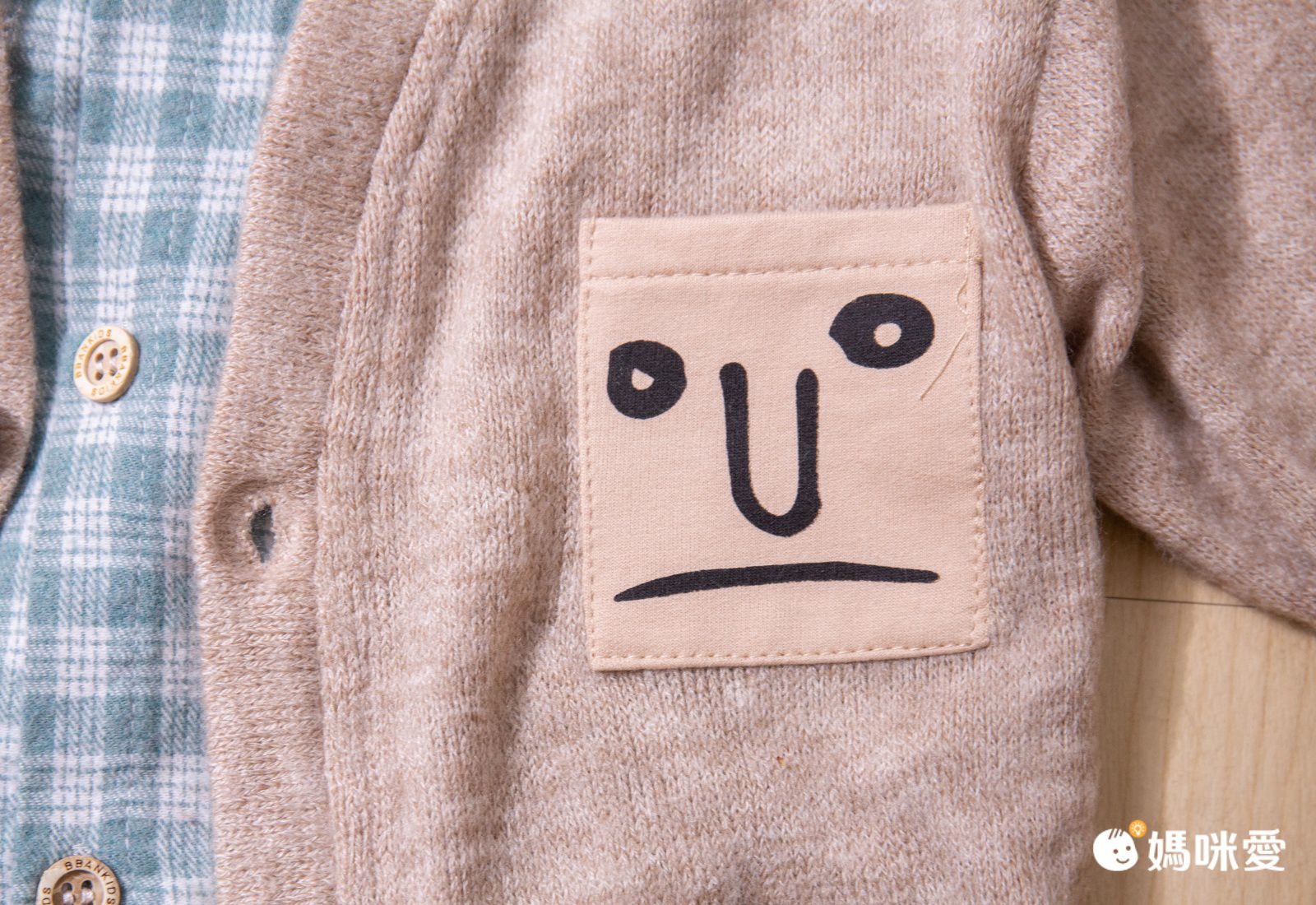木製風格的釦子加上英文字,看起來很有質感