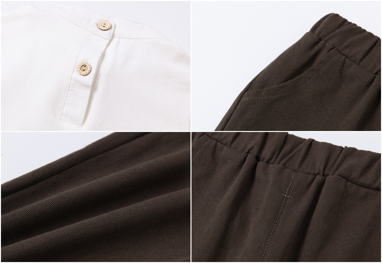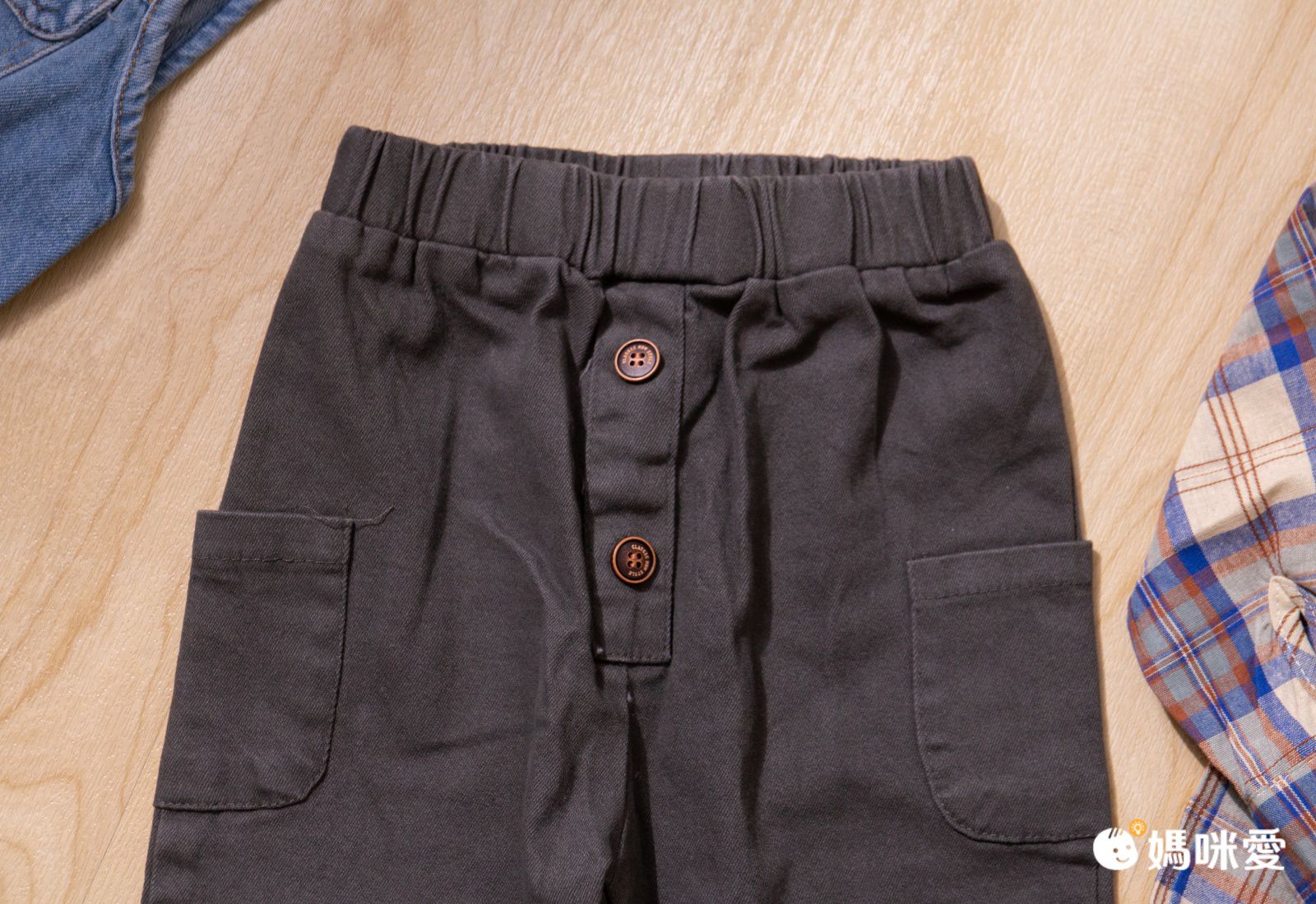 褲子採用鬆緊帶設計,前方有兩個扣子做裝飾,兩側也有口袋設計,實用又好看