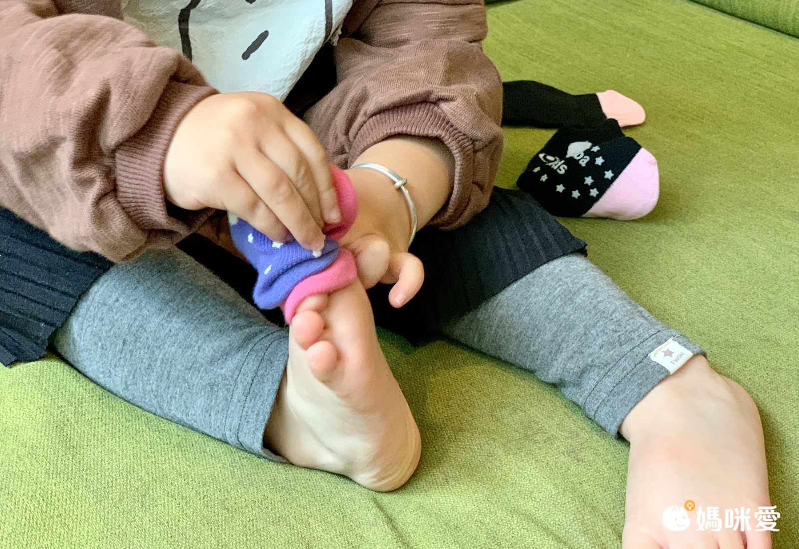 紜紜正在練習自己穿襪子,有了萌萌的襪子後,學習意願大增啊!