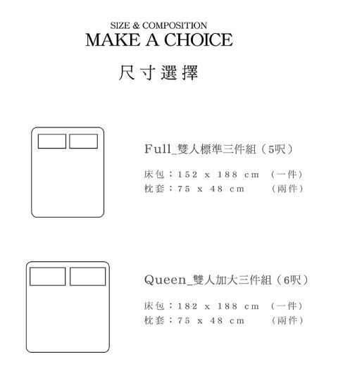 內容:標準雙人- 床包152x188cm/枕套2個 75x48cm;加大雙人- 床包182x188cm/枕套2個 75x48cm