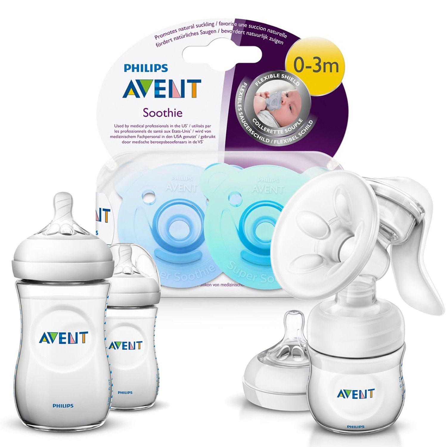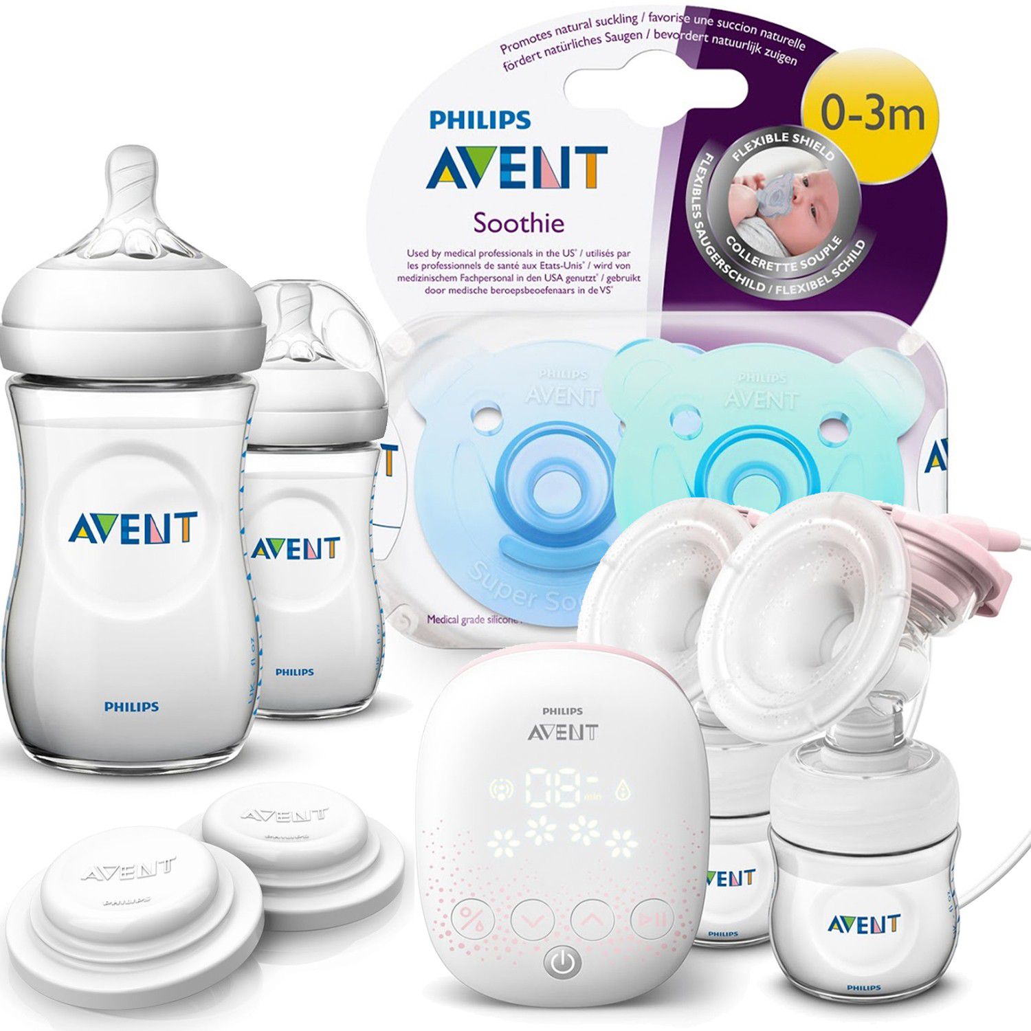 吸乳器本體與握把*1、旅行用外蓋*1、標準按摩襯墊*1、奶水儲存杯密封蓋*1、Natural奶瓶4盎司*1、乳墊試用包*1(2件)、親膚感新生兒流量奶嘴*1