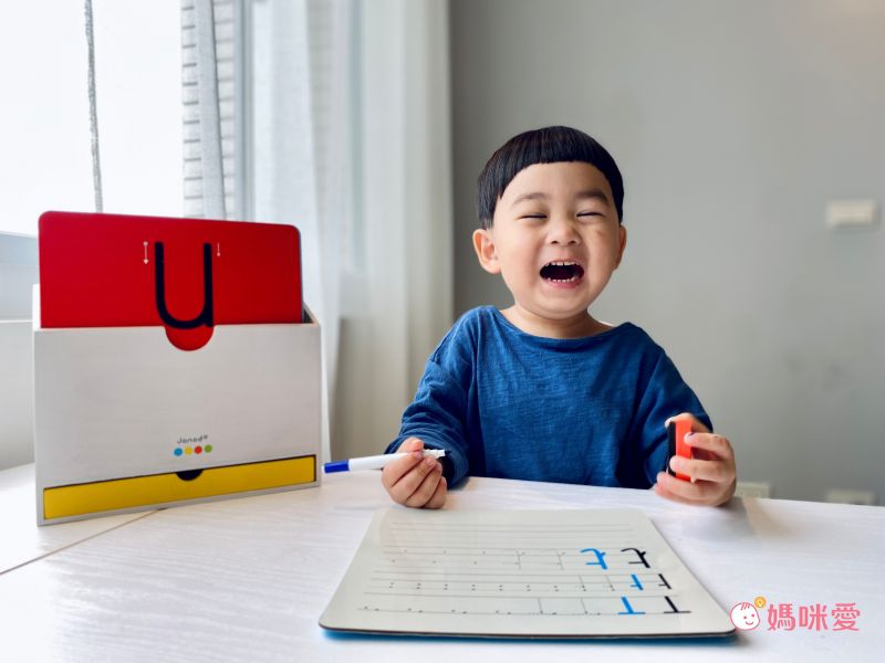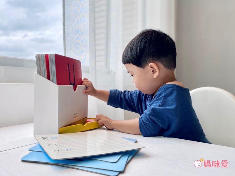 紙卡的邊緣很圓滑,不會割傷孩子的小手。子惟很開心展示自己寫出的字母。