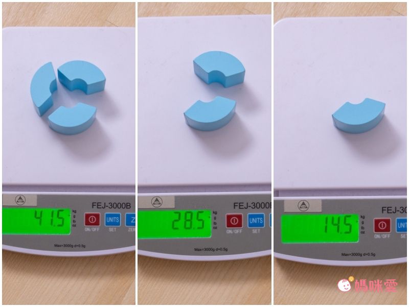 也可以把蛋糕放在秤上面,讓孩子認識體積與重量的等量均分。