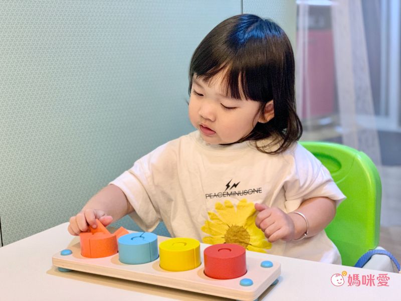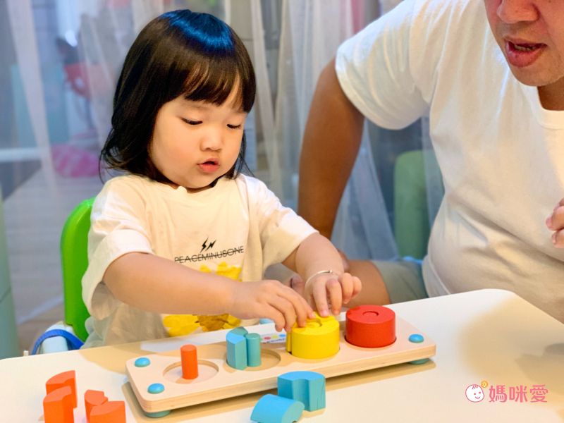 子惟先從木樁開始熟悉玩法,這對他來說很簡單,很快就愈玩愈順囉!促進手眼協調,鍛鍊手部的肌肉。
