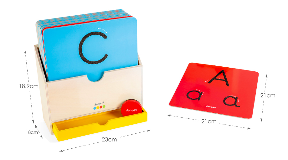 學習字母卡有兩面,一面是讓孩子用手指觸摸來學習字母的筆畫和筆順,另一面是用筆實際寫出字母。