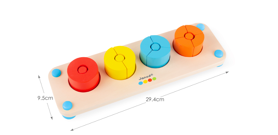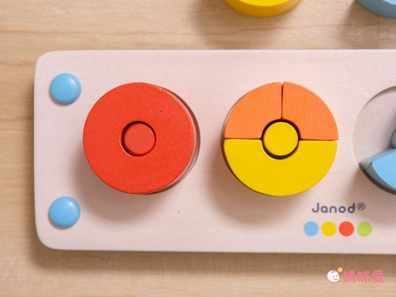 法國 Janod 等分板把分數的意義視覺化,讓孩子開始學習比 1 小的數字概念,引導孩子發現完整的蛋糕被切分之後,會比完整的蛋糕小,那是小多少呢?透過這樣的方式,讓孩子自然理解分數的概念。學習版有四個圓圈圈,顏色鮮驗好認知。一開始是完整一個圓,第二個是二分之一、第三個、第四個愈分愈多。