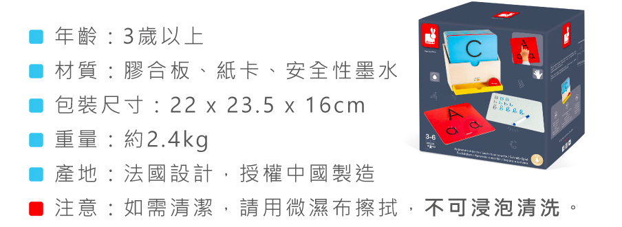 內容物:26張雙面字母卡、白板筆1支、小板擦1個及收納盒1個