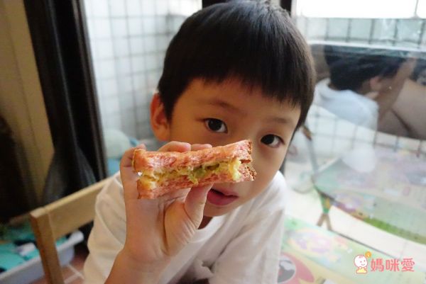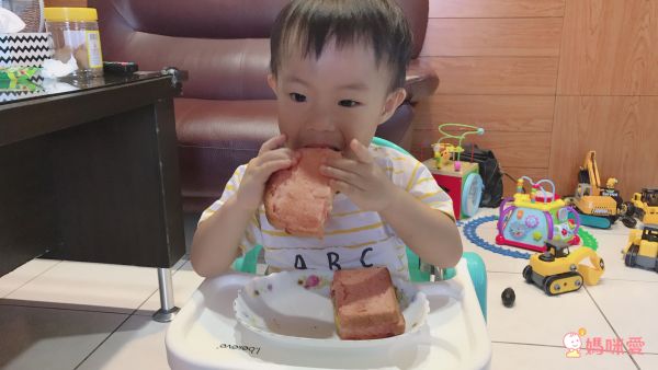 2y的花生米也開心的大口咬下,粉紅色吐司對他來說很有吸引力呢!