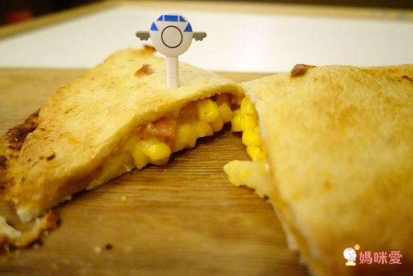 超多種餡料有玉米、洋蔥、蟹肉棒、章魚丁、蝦仁,光看到玉米寶貝立刻點頭說要吃,玉米可以征服宇宙了吧!