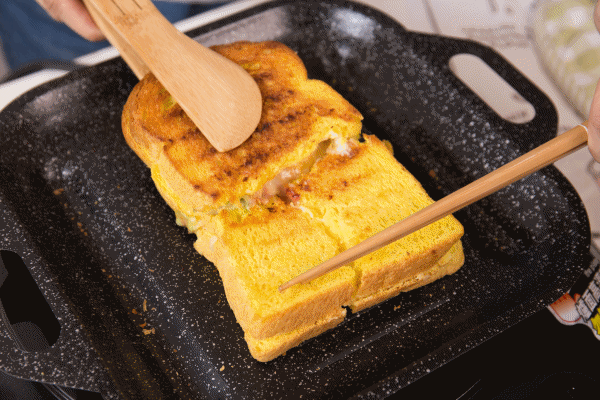 和前面所介紹的一樣,剛加熱完的吐司會呈現鬆軟狀態,想要吃到好吃的香脆吐司,就是要把兩面煎到酥脆,美味的爆漿吐司就能上桌了!