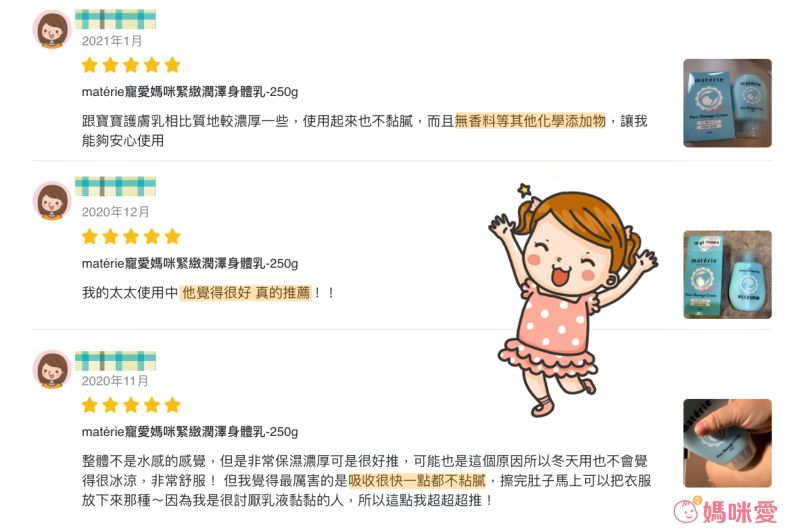今天要推薦給孕媽咪們 阿卡將本舖獨家販售 matérie 寵愛媽咪緊緻潤澤身體乳,滋潤成分添加15種氨基酸,讓肌膚水潤澎彈、維持在飽水的狀態。產品完全無添加香料、無異味、無色素、無酒精,無論是懷孕期間身體護理,或是產後自信復出~都強烈推薦給媽咪們唷!
