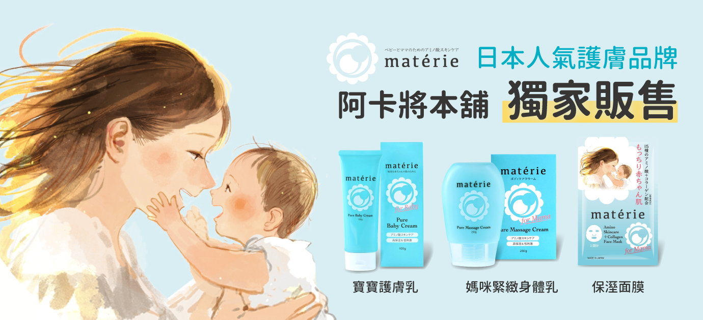 阿卡將本舖獨家販售『matérie 純淨寶寶護膚乳』,滋潤成分添加15種氨基酸、溫柔呵護新生兒的肌膚!產品完全無添加香料、無異味、無色素、無酒精,媽咪可以非常放心給寶貝使用~寶寶的臉部與身體都可以用!