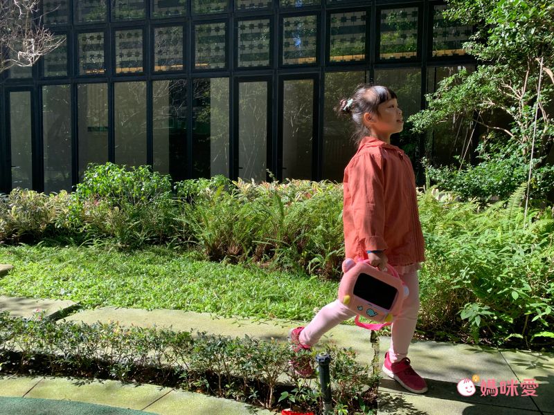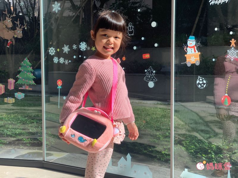 熙熙身高大約 110 公分,背帶的長度背在身上很 OK。小鯨魚唱跳機外殼為防摔材質,但還是很貼心的附送專用的保護套,熙熙開心地背著出門囉!