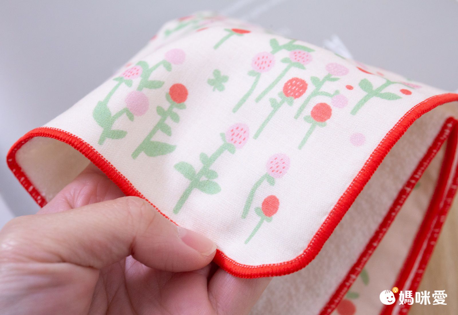 一層紗布、一層毛圈組織,吸水性強。現在防疫新生活,編媽就放一條在公司當作洗完手的擦手巾用,一下就擦乾,清爽的感覺很有清潔乾淨的儀式感~