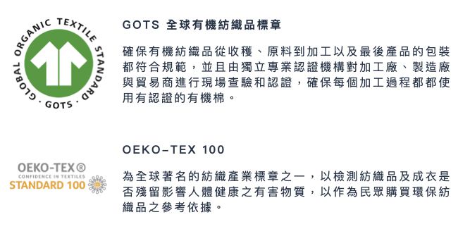 它們的有機棉來源值得信賴,獲得GOTS(全球有機紡織品標章)、OEKO-TEX 100兩大環保認證標章。