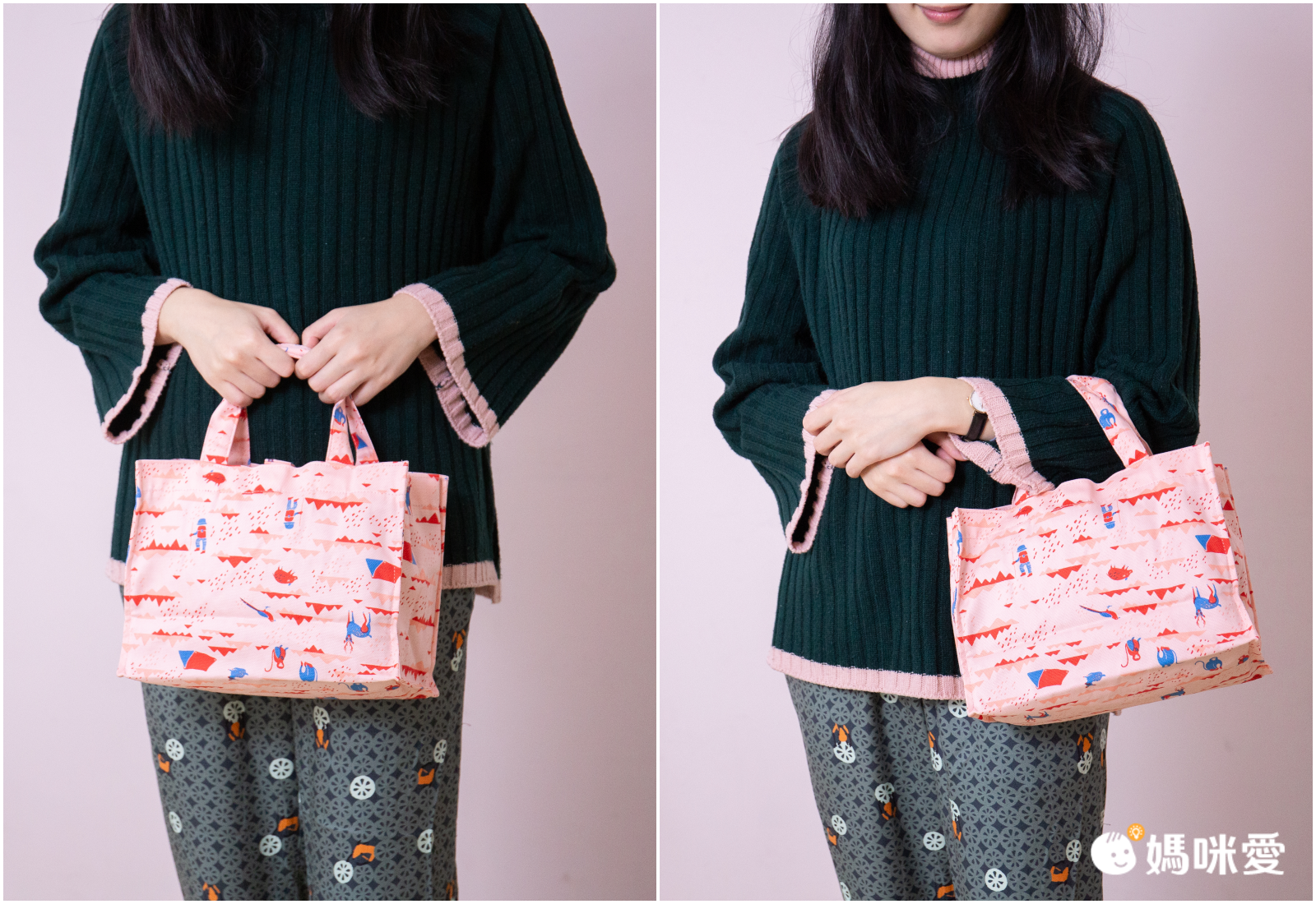 可以隨手放東西、隨手掛,拎著出去買午餐、逛超商,設計依然有型,寬寬的手把很好提。