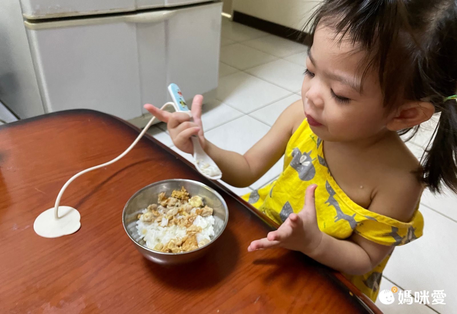 荷包蛋小手手的小肌肉已經發展到可以好好握著湯匙把食物放進嘴裡,自己吃飯好有自信!