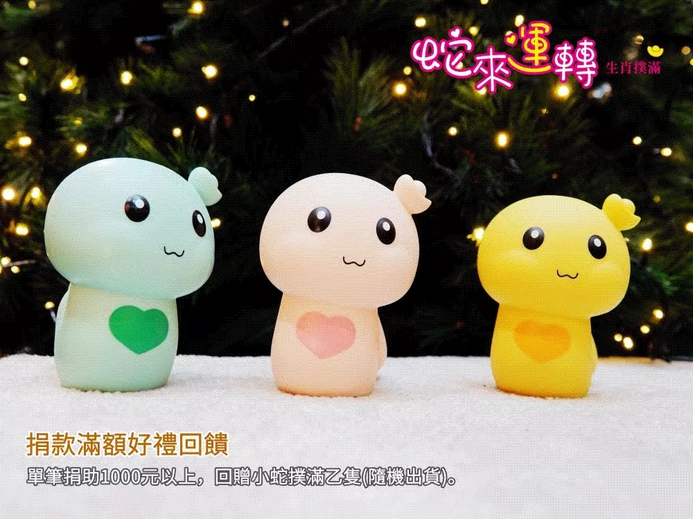 凡單筆捐助1,000元以上,幫助小朋友有穩定的愛心早餐,世界和平會即回贈【小蛇撲滿】乙只 (隨機出貨),讓靈動又可愛的蛇家三兄妹希望陪伴您的生活、課業與事業一帆風順!