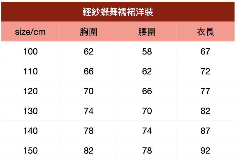 附上尺寸表給媽咪們參考~輕紗蝶舞襦裙洋裝