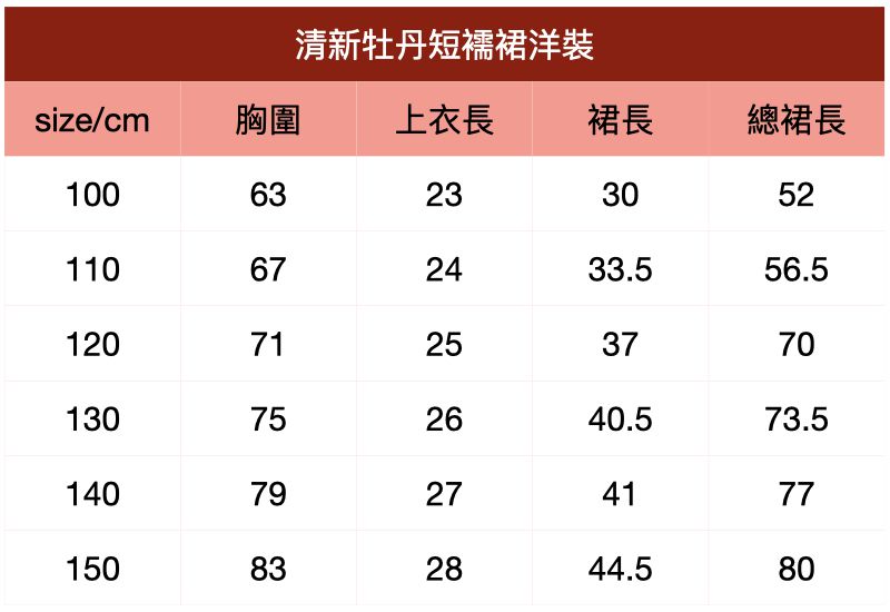 附上尺寸表給媽咪們參考~清新牡丹短襦裙洋裝
