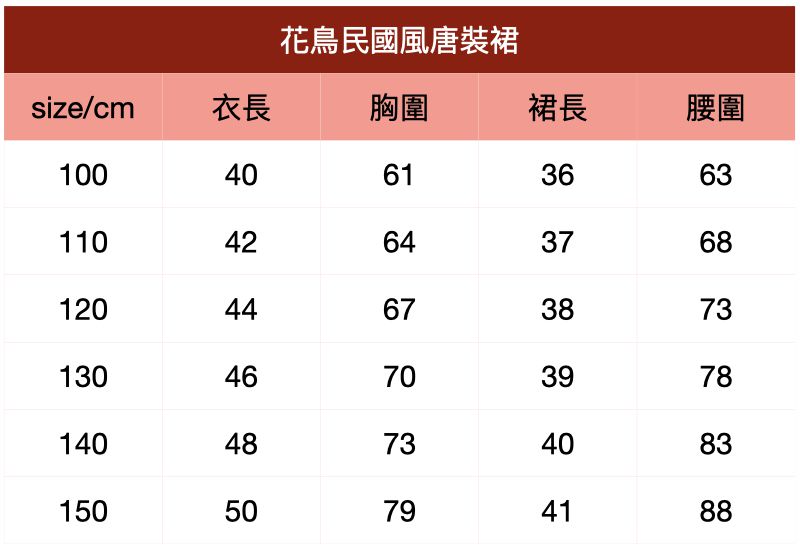 附上尺寸表給媽咪們參考~花鳥民國風唐裝裙