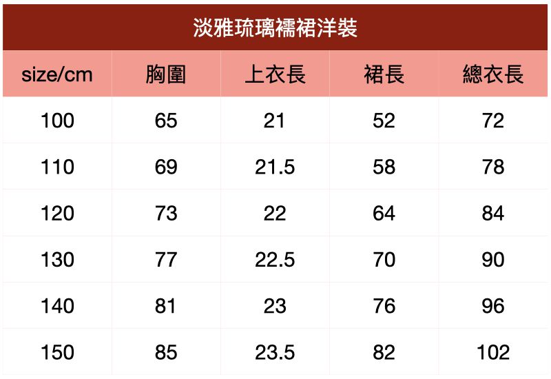 附上尺寸表給媽咪們參考~淡雅琉璃襦裙洋裝