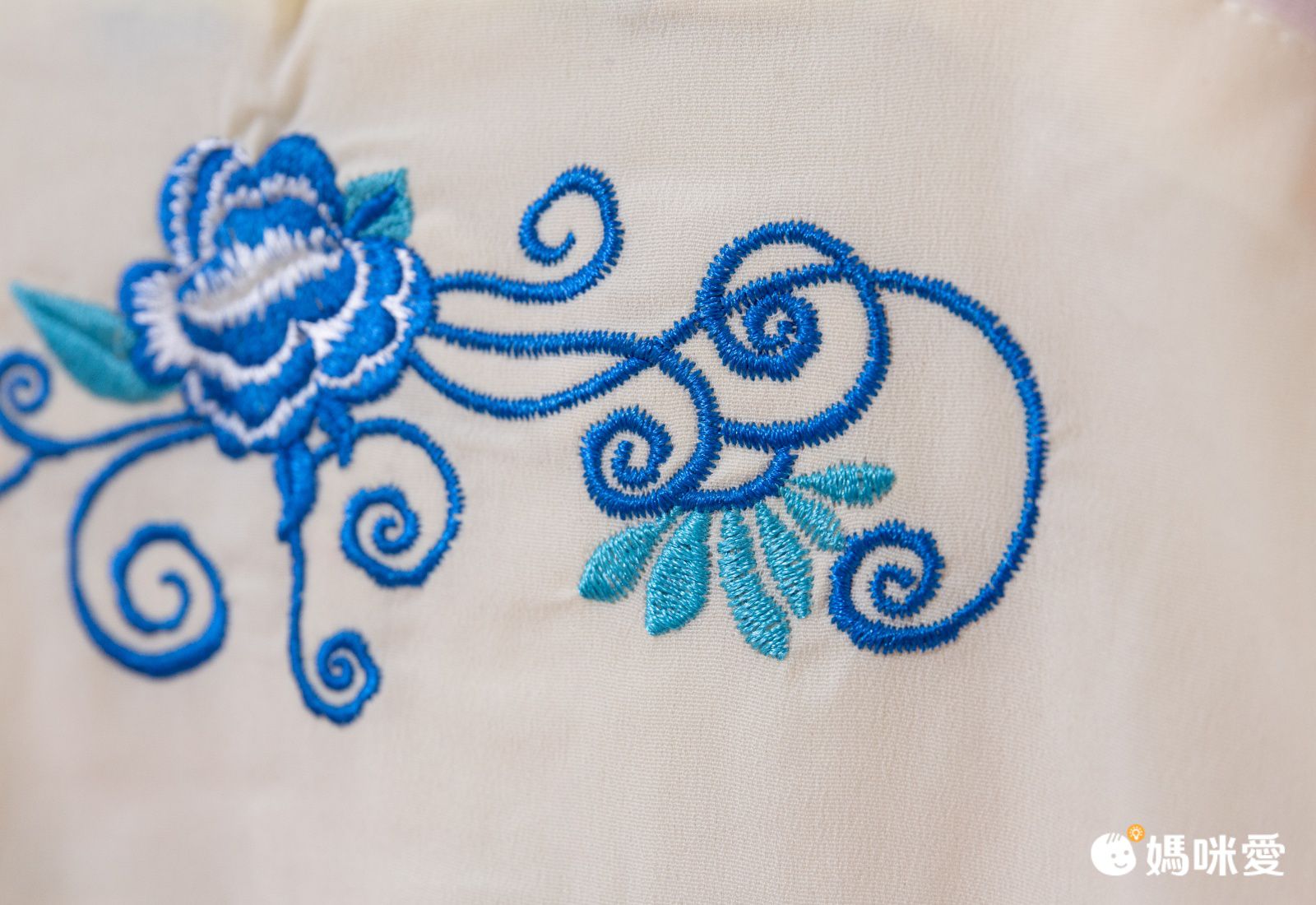 中間蝴蝶在花朵間飛舞的刺繡,相當細緻,再搭配腰間的緞帶,不管是蝴蝶結還是稍微繞一下都別有風情