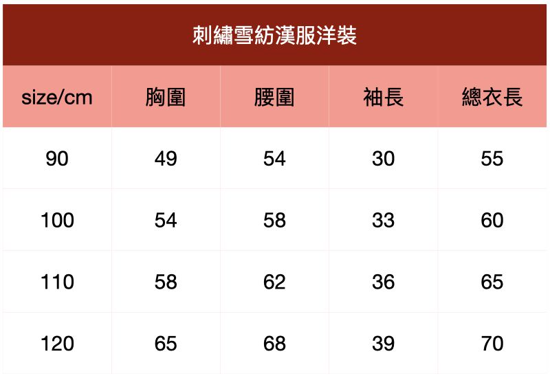 附上尺寸表給媽咪們參考~刺繡雪紡漢服洋裝