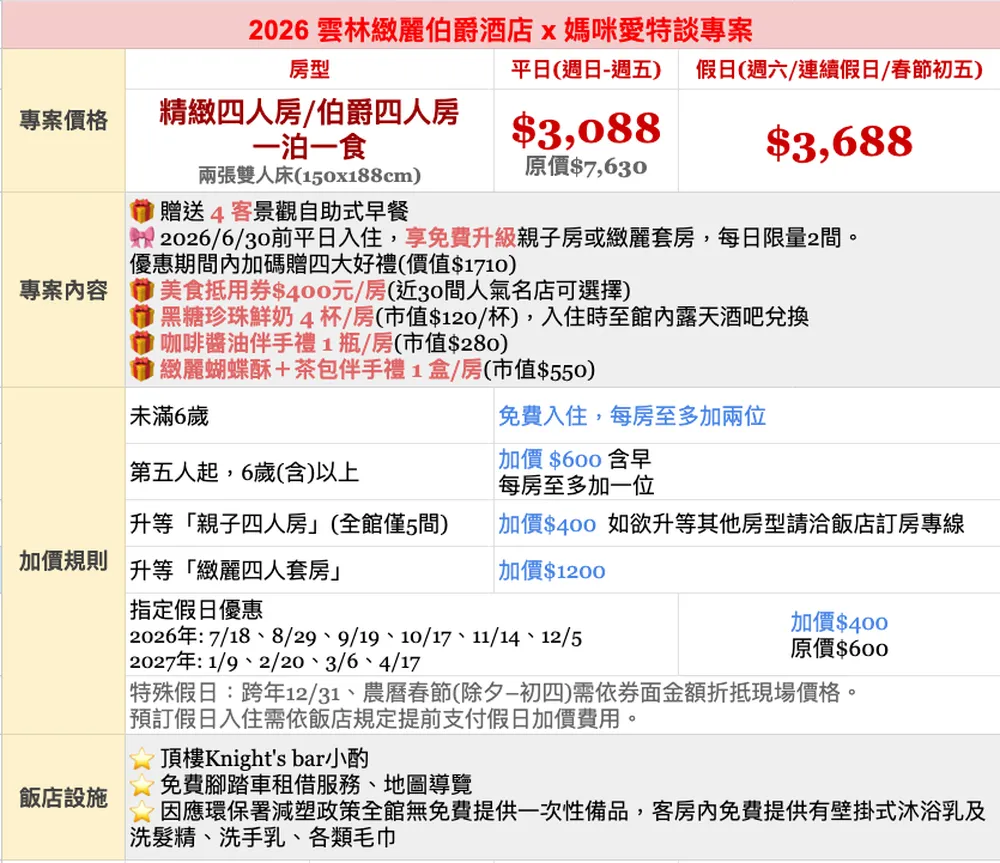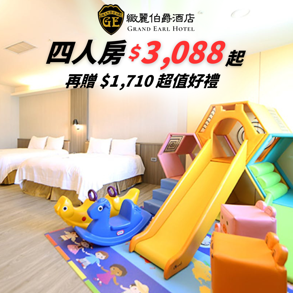 加碼升等:2026/6/30前,平日入住享免費升等親子四人房或緻麗套房!(每日限量2間)