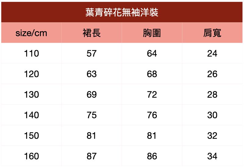 附上尺寸表給媽咪們參考~葉青碎花無袖洋裝