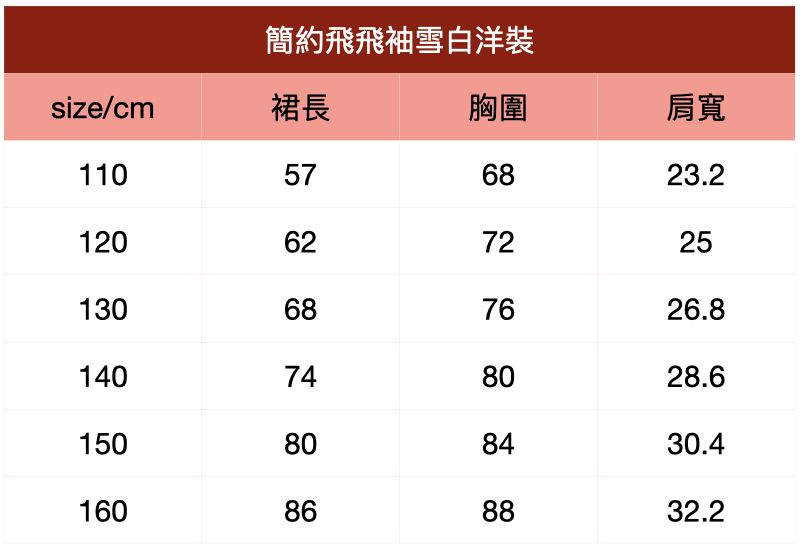 附上尺寸表給媽咪們參考~簡約飛飛袖雪白洋裝