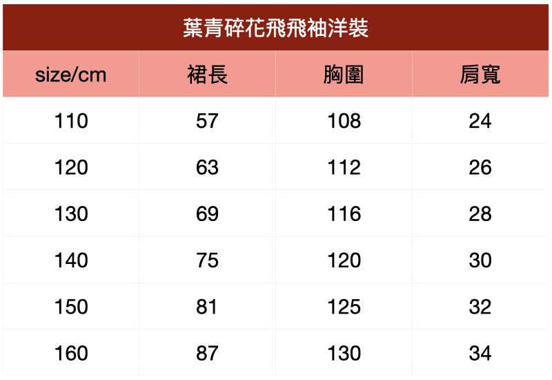 附上尺寸表給媽咪們參考~葉青碎花飛飛袖洋裝