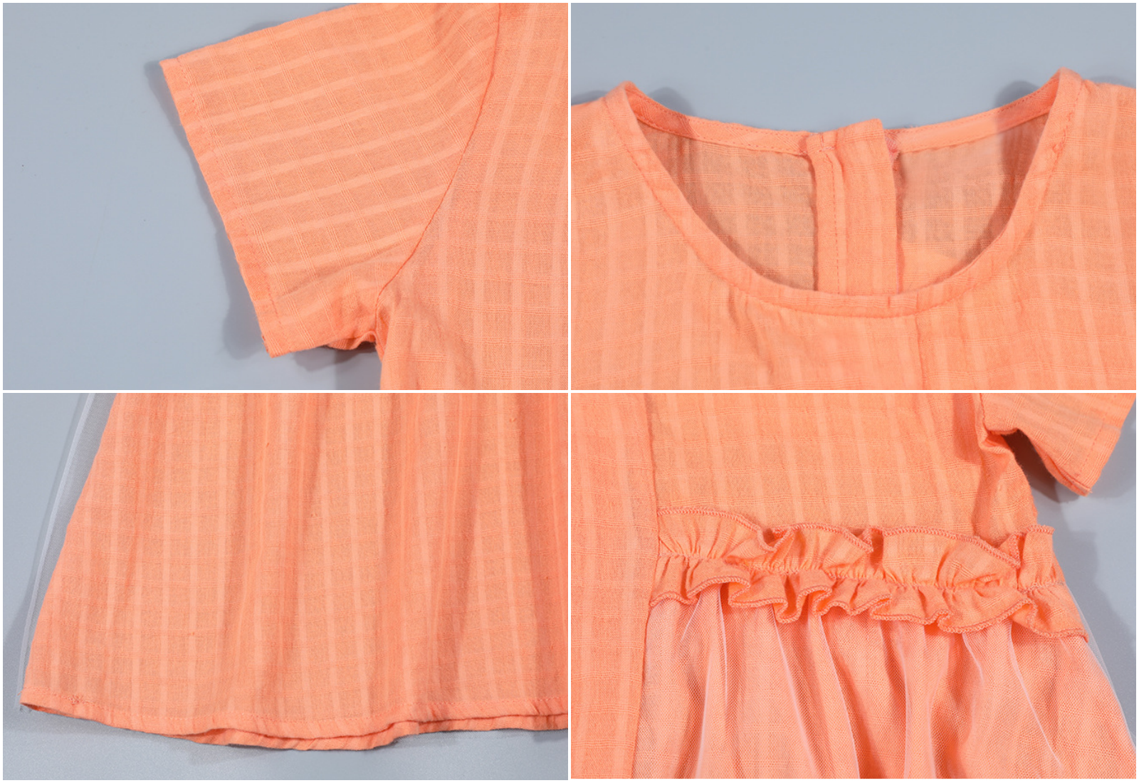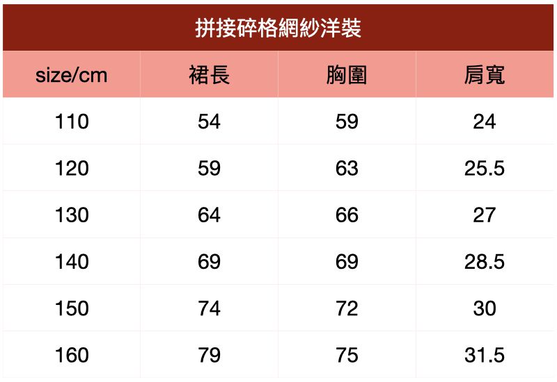 附上尺寸表給媽咪們參考~拼接碎格網紗洋裝
