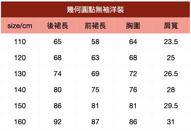 附上尺寸表給媽咪們參考~幾何圓點無袖洋裝