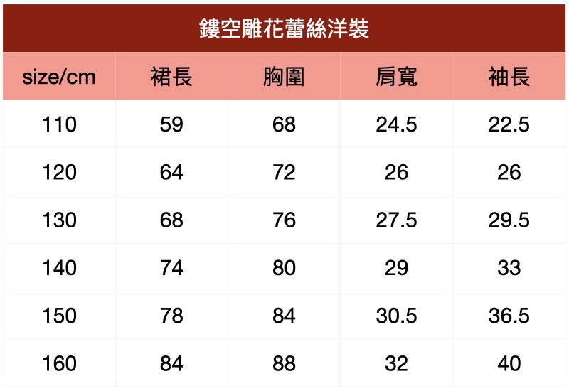 附上尺寸表給媽咪們參考~鏤空雕花蕾絲洋裝