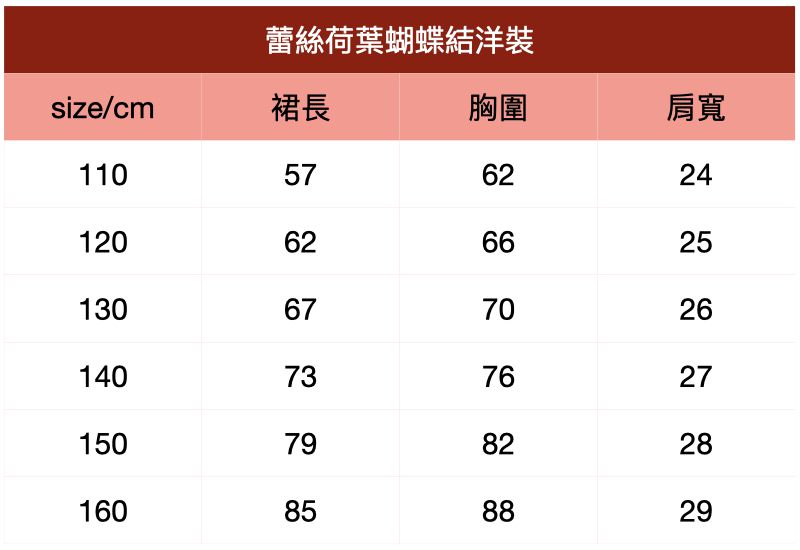附上尺寸表給媽咪們參考~蕾絲荷葉蝴蝶結洋裝