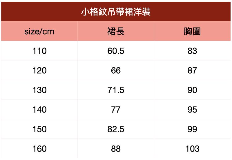 附上尺寸表給媽咪們參考~小格紋吊帶裙洋裝