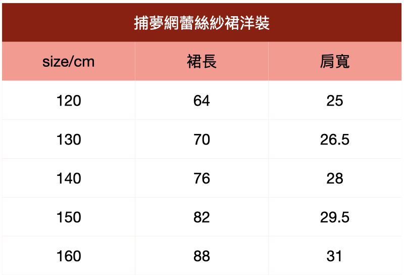 附上尺寸表給媽咪們參考~捕夢網蕾絲紗裙洋裝