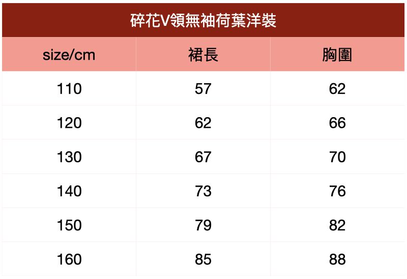 附上尺寸表給媽咪們參考~碎花V領無袖荷葉洋裝