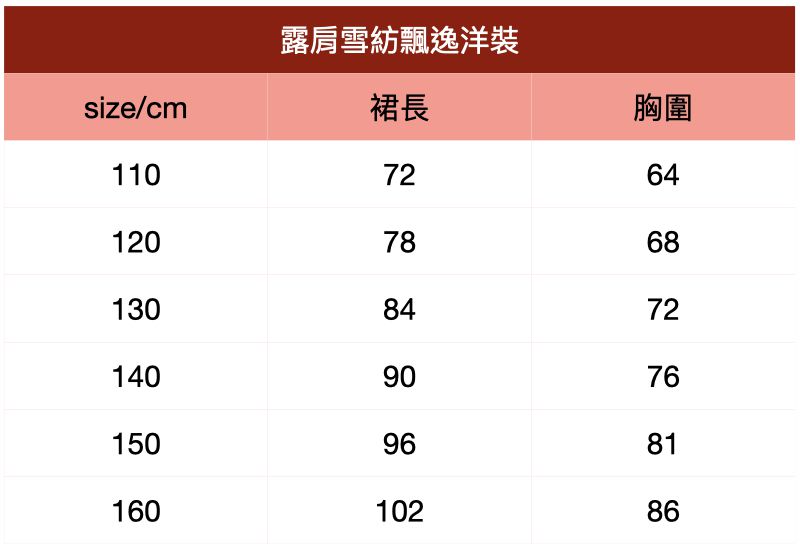 附上尺寸表給媽咪們參考~露肩雪紡飄逸洋裝