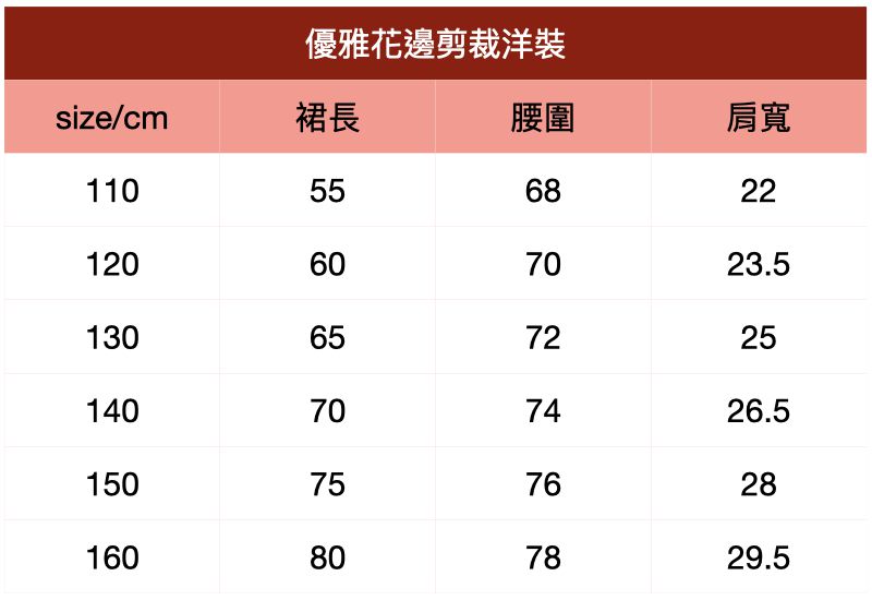 附上尺寸表給媽咪們參考~優雅花邊剪裁洋裝