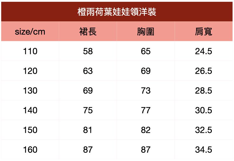附上尺寸表給媽咪們參考~橙雨荷葉娃娃領洋裝