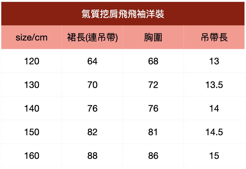 附上尺寸表給媽咪們參考~氣質挖肩飛飛袖洋裝