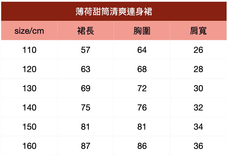 附上尺寸表給媽咪們參考~薄荷甜筒清爽連身裙